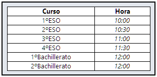 El próximo lunes 15 de septiembre será el primer día lectivo del curso. Los tutores recibirán al alumnado en sus aulas respectivas conforme a los siguientes horarios. Al día siguiente, las clases ya se desarrollarán según el horario establecido, comenzando a las 08:30. Las 7ª horas se iniciarán el 22 de septiembre para el alumnado Bachibac, y el 1 de octubre para los programas lingüísticos de la ESO. Los listados de los grupos se publicarán en la web antes del día 15. |