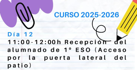 El Curso 2025/2026 está a punto de empezar, y como es habitual vamos a realizar la tradicional recepción del alumnado de 1ºESO. La llevaremos a cabo el próximo viernes 12 de septiembre, a las 11:00. El acceso se realizará por la puerta lateral del patio. Se estima que la duración de las actividades sea de 1 hora. |